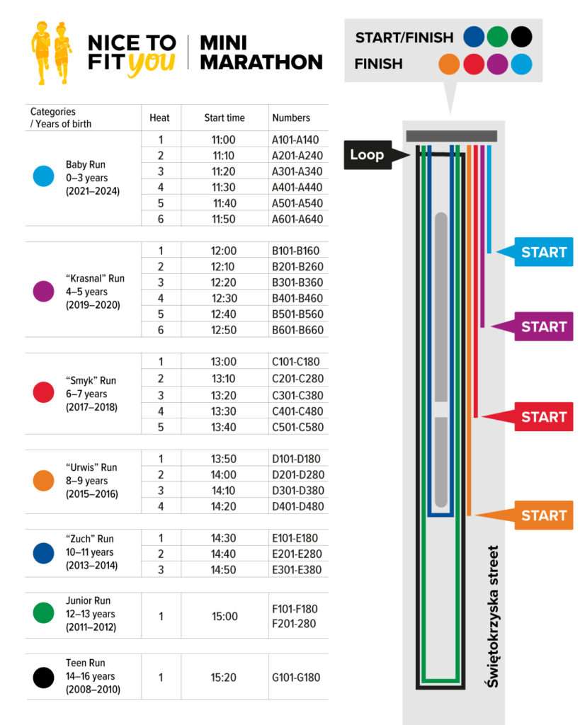 The category, distance, and starting time depend on the child’s age – take a look at the graphic below. The given times are approximate. The start and finish of the Nice To Fit You Mini Marathon are located at the foot of the Palace of Culture and Science, on Świętokrzyska Street.